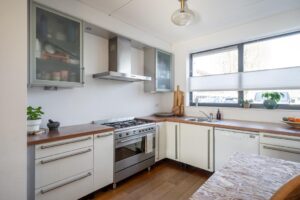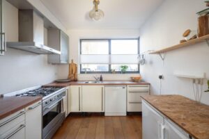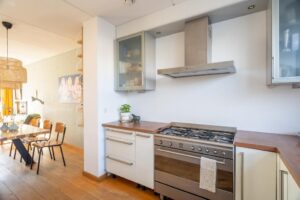 De keuken bevindt zich aan de voorzijde en heeft een grote raampartij. Tijdens het koken heb je dan ook prettig contact met buiten; je kijkt plezierig vrij weg. Aan de overkant van de straat kijk je namelijk niet tegen huizen aan. Hier bevindt zich een school waarvan het terrein op dit moment nieuw ingericht wordt. De nieuwe inrichting zorgt er voor dat je vanuit je huis straks nog plezieriger weg zal kijken op een schoolplein en groen en dus niet op vaste bebouwing. De keuken is in natureltinten met een houtlook-blad en beschikt over een 5-pits SMEG gasfornuis met grote oven, wasemkap, vaatwasser en koel- en vrieskast.