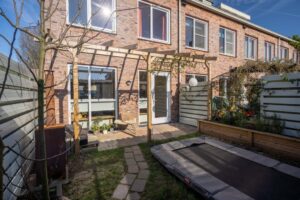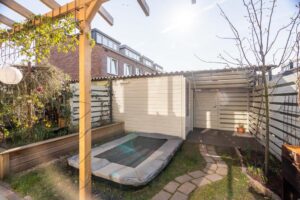 De achtertuin ligt op het zuid/zuidoosten en is daarmee heerlijk zonnig. De bestrating, pergola met blauwe regen en een peren- en appelboom zorgen voor een gezellig geheel. De tuin ligt haaks op de percelen achter het huis waardoor je vrij zicht en veel privacy hebt. Achterop het perceel staat een houten berging met handige overkapping. Ook vind je hier de poort naar je achterom.