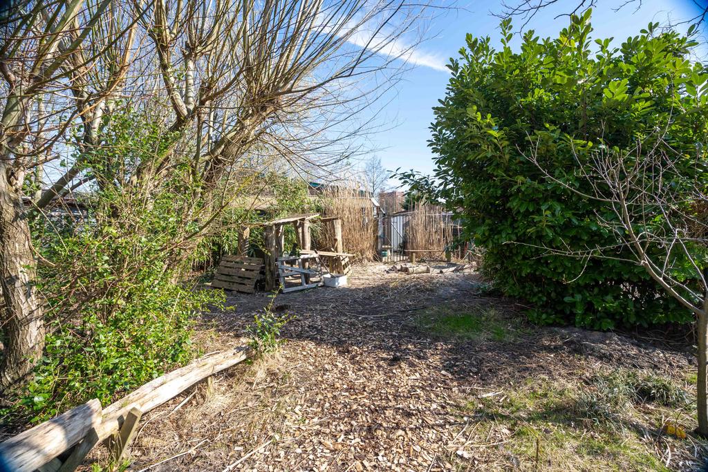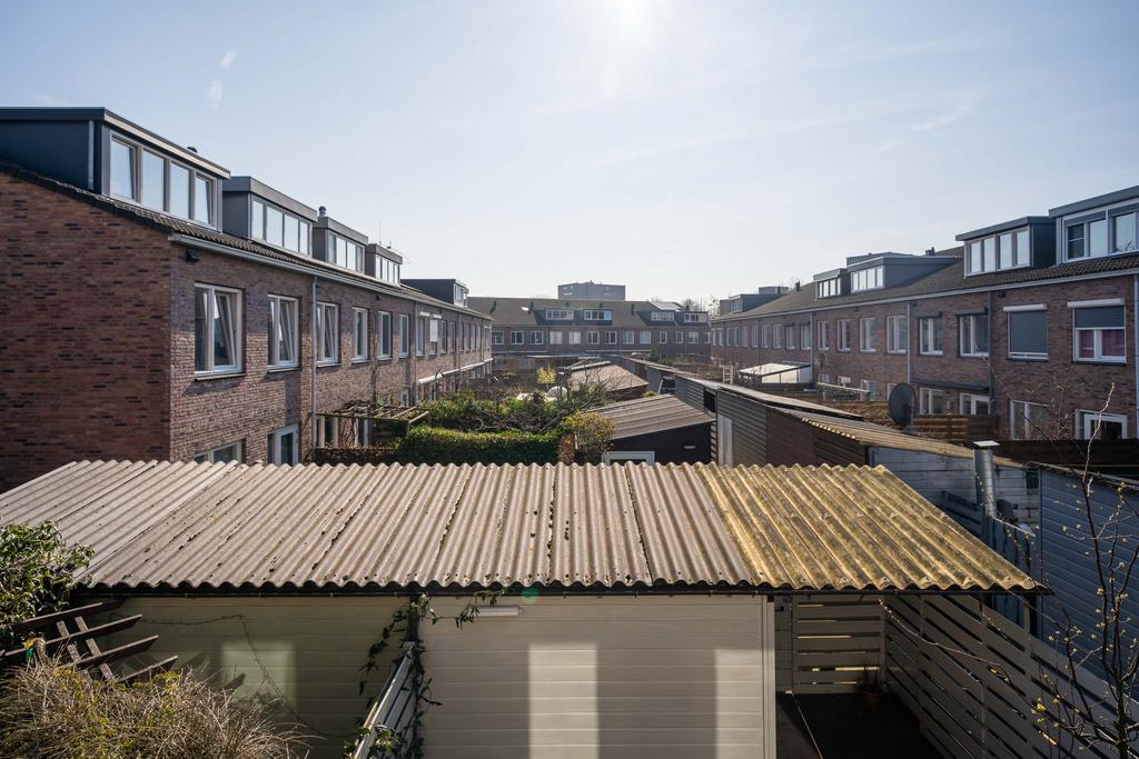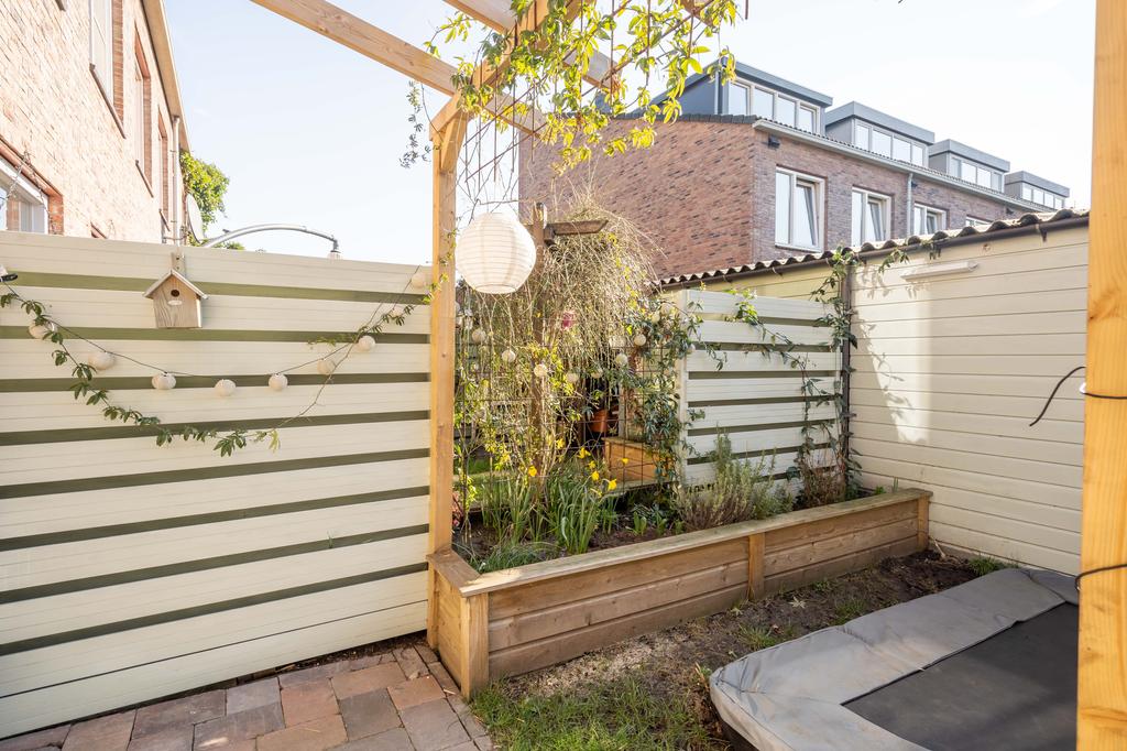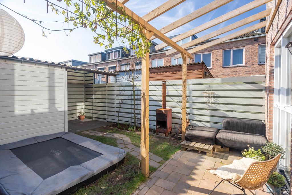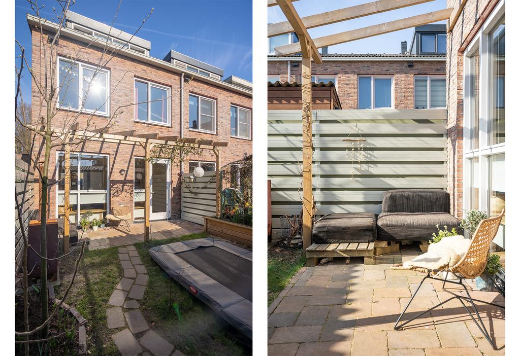 De achtertuin ligt op het zuid/zuidoosten en is daarmee heerlijk zonnig. De bestrating, pergola met blauwe regen en een peren- en appelboom zorgen voor een gezellig geheel. De tuin ligt haaks op de percelen achter het huis waardoor je vrij zicht en veel privacy hebt. Achterop het perceel staat een houten berging met handige overkapping. Ook vind je hier de poort naar je achterom.