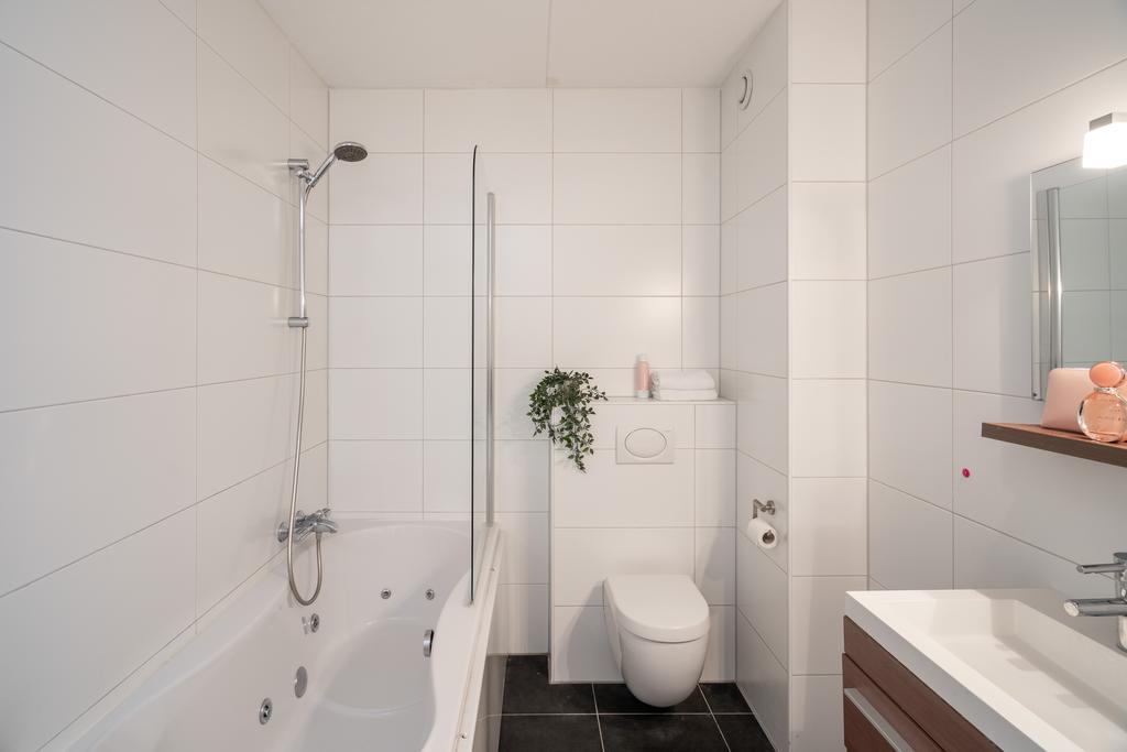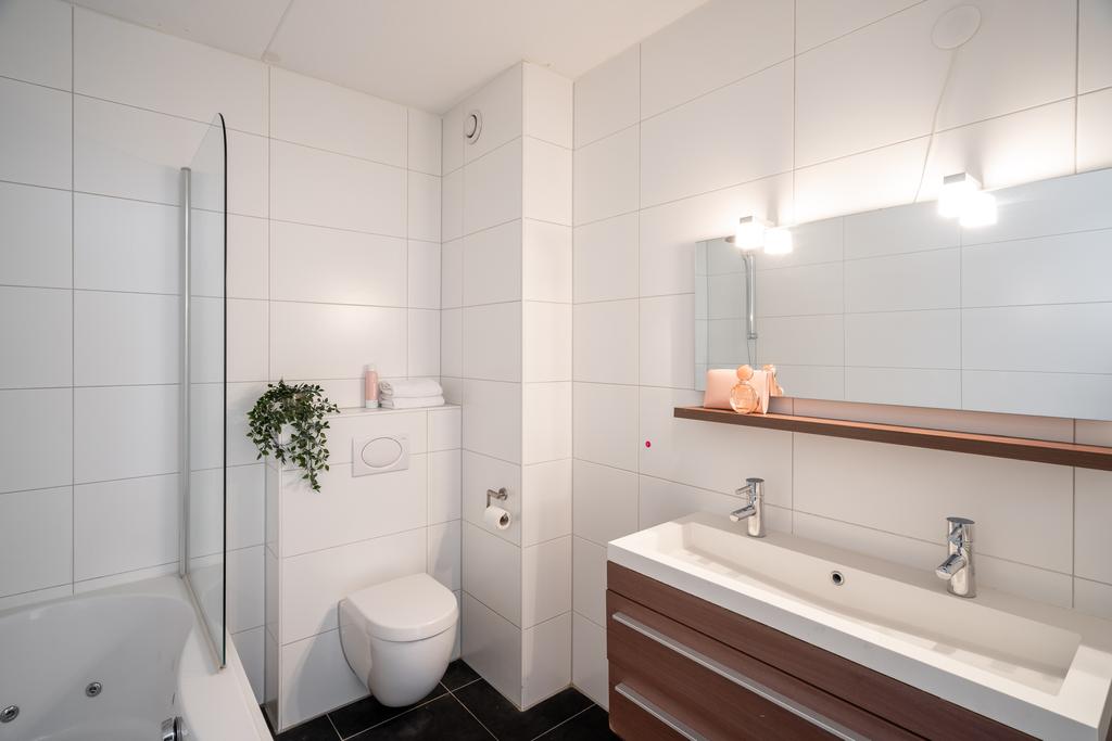 De badkamer is netjes afgewerkt met een fraaie grote witte tegel op de wanden en een donkergrijs betegelde vloer. Verder beschikt de badkamer over bad/douche met jacuzzi, een hangend closet, designradiator en een dubbele wastafel met meubel.