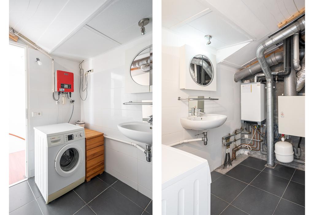 Tenslotte vind je op deze woonlaag nog een grote wasruimte met aansluiting voor wasmachine en wasdroger. In deze kamer bevindt zich ook de CV-ketel, de WTW-installatie en de omvormer behorende bij de 12 stuks zonnepanelen (2018).