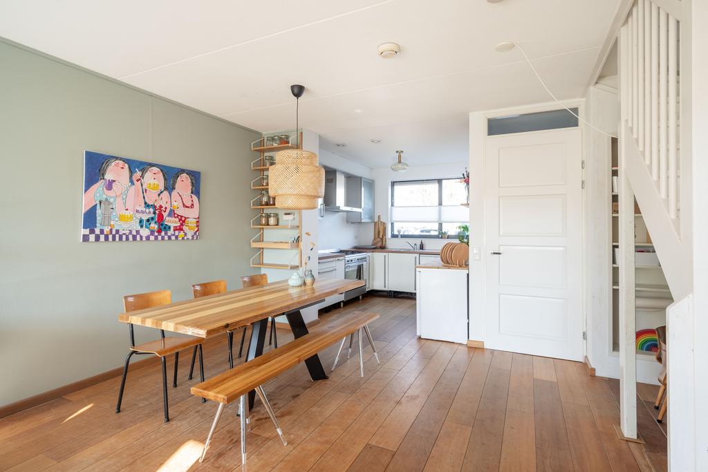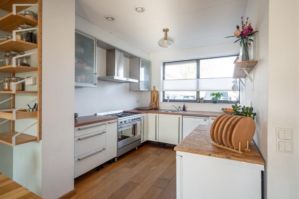 De keuken bevindt zich aan de voorzijde en heeft een grote raampartij. Tijdens het koken heb je dan ook prettig contact met buiten; je kijkt plezierig vrij weg. Aan de overkant van de straat kijk je namelijk niet tegen huizen aan. Hier bevindt zich een school waarvan het terrein op dit moment nieuw ingericht wordt. De nieuwe inrichting zorgt er voor dat je vanuit je huis straks nog plezieriger weg zal kijken op een schoolplein en groen en dus niet op vaste bebouwing. De keuken is in natureltinten met een houtlook-blad en beschikt over een 5-pits SMEG gasfornuis met grote oven, wasemkap, vaatwasser en koel- en vrieskast.