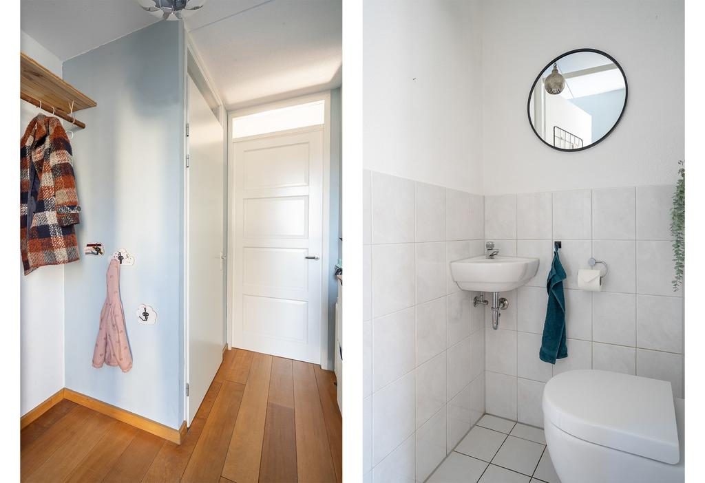 Aan de voorzijde van het huis vind je een kleine voortuin. Leuk om hier een bankje te plaatsen of een fijne groene plek van te maken. Via de entree kom je vervolgens in hal met toiletruimte met fonteintje en de meterkast. Er is een handige nis voor de garderobe. Over de gehele benedenverdieping ligt een houten vloer.