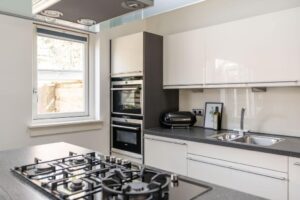 De hoogwaardig afgewerkte keuken is voorzien van granieten werkblad, 5-pits gas-op-glas kookplaat met grote wokbrander en diverse inbouw apparatuur waaronder een koffiezetapparaat, koel/vriescombinatie, combimagnetron en combi-stoomoven (alles van Siemens)