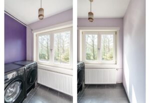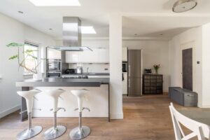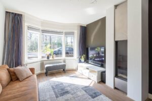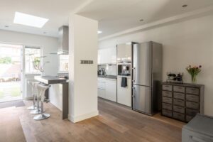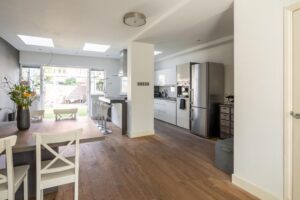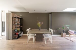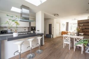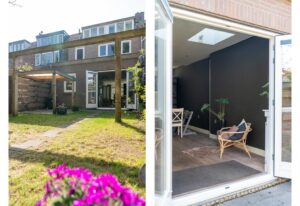 De ruime en sfeervolle woonkamer loopt aan de achterzijde door in een grote open keuken met kookeiland en openslaande deuren naar de achtertuin. De drie lichtvensters in de uitbouw brengen optimaal licht naar binnen.