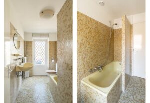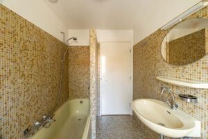 De vaste trap in de hal brengt je naar de eerste verdieping met ruimte overloop, twee grote slaapkamers, wasruimte en ruime badkamer. Op de vloer ligt een fraaie doorgelegde laminaat. De grote slaapkamer aan de achterzijde heeft ramen over de gehele breedte en beschikt over een dubbele wastafel. De slaapkamer aan de voorzijde heeft weer de charmante erker die meteen veel sfeer geeft. Ideaal is de handige aparte wasruimte met plek voor zowel wasmachine als droger en ruimte om je was op te hangen; fijn uit het zicht. De badkamer is van plezierig formaat, heeft veel daglicht en beschikt over een ruim bad met douche, toilet en wastafelmeubel.
