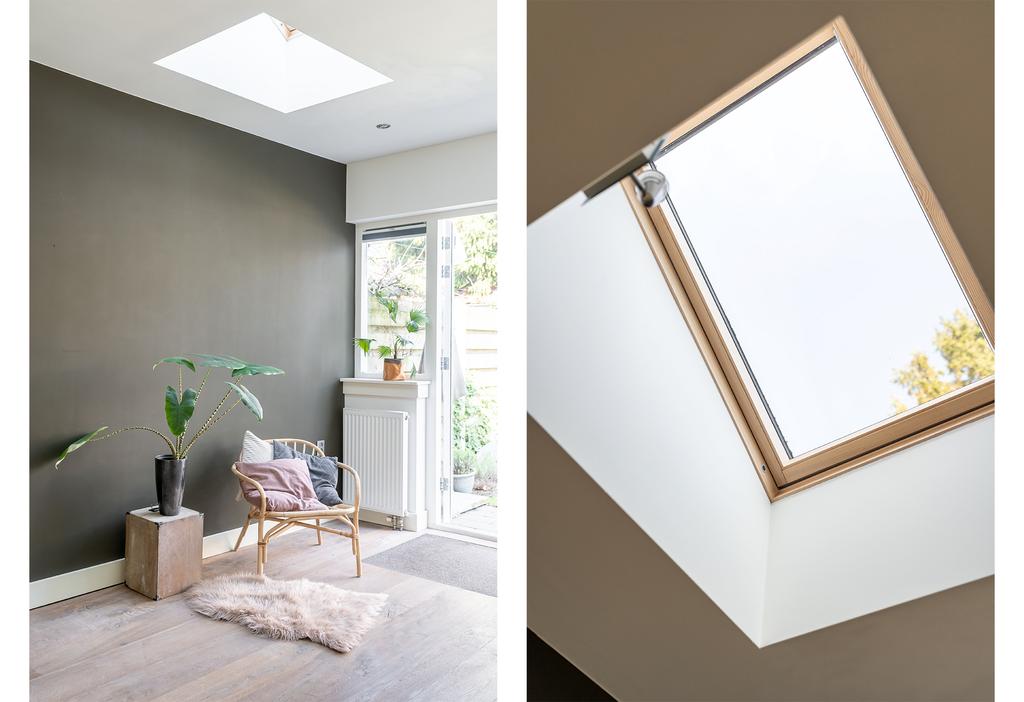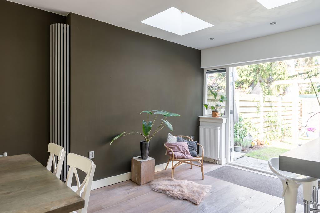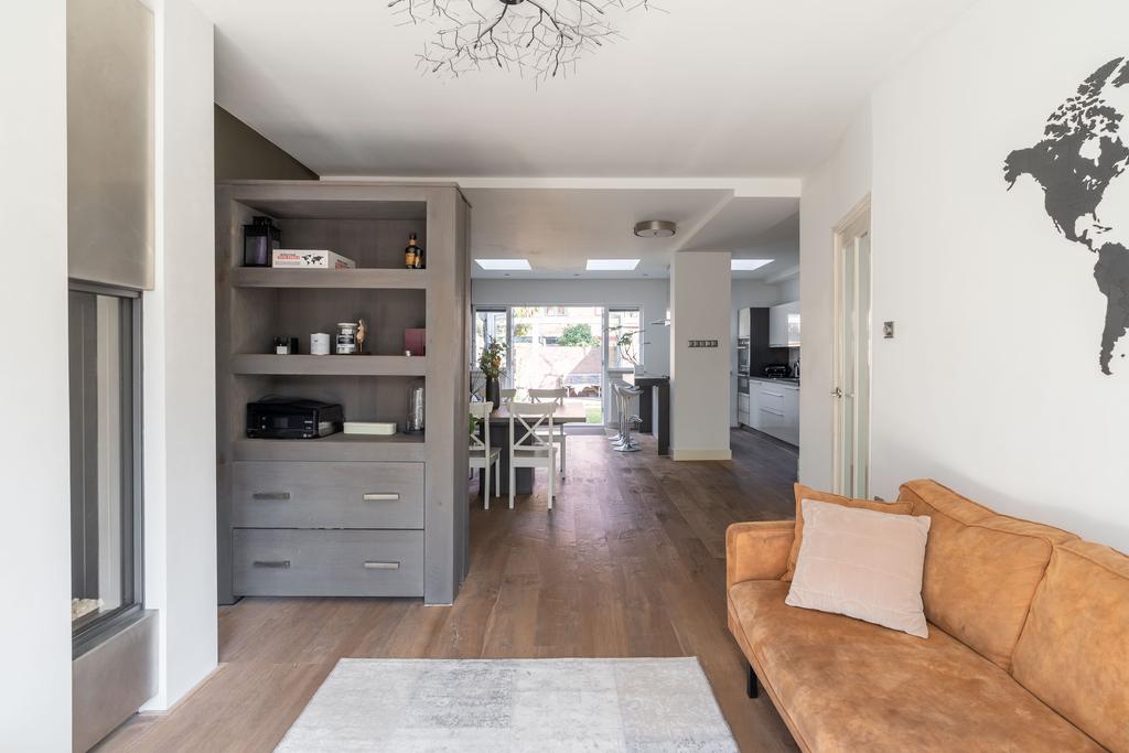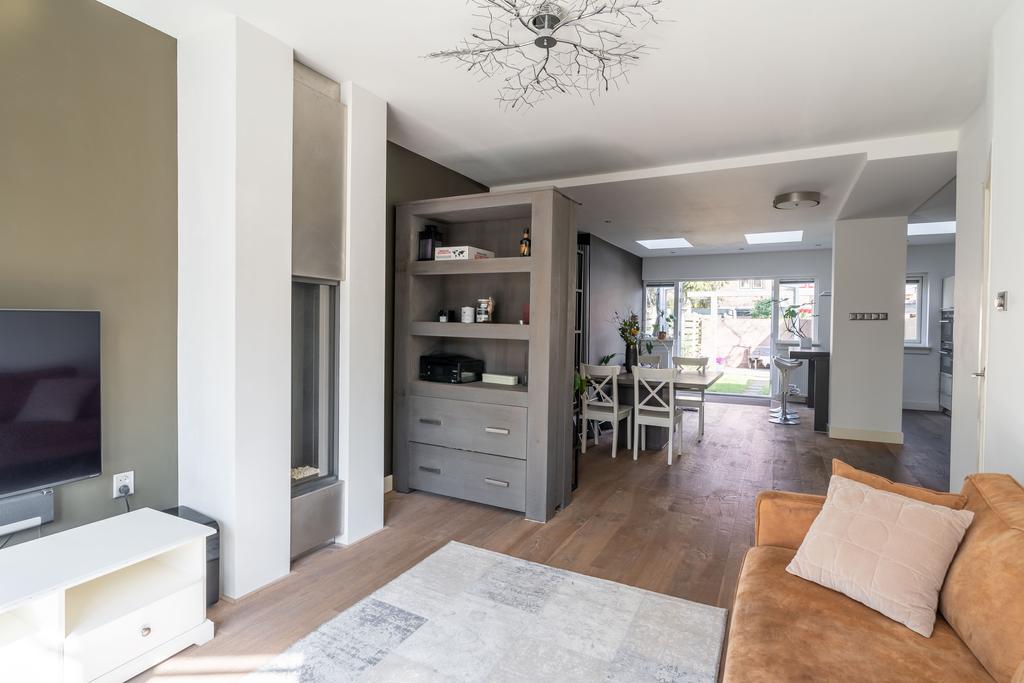 De ruime en sfeervolle woonkamer loopt aan de achterzijde door in een grote open keuken met kookeiland en openslaande deuren naar de achtertuin. De drie lichtvensters in de uitbouw brengen optimaal licht naar binnen.