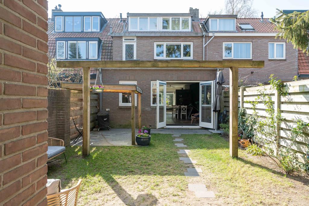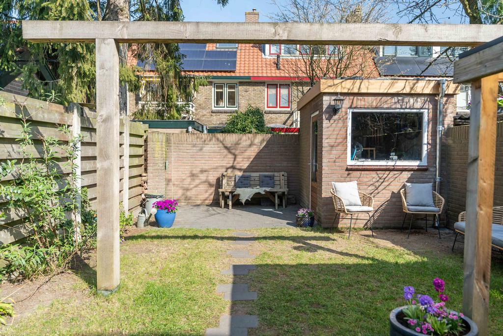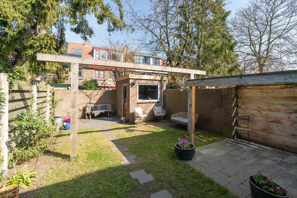 De tuin is omsloten, heeft een achterom en is een aangename plek om te genieten van rust en privacy. De tuin ligt op het noordoosten, echter door de diepte van het perceel heb je zowel ’s ochtends als ’s avonds volop zon in de tuin. In de tuin bevindt zich tenslotte de berging met genoeg ruimte voor fietsen en tuinspullen.