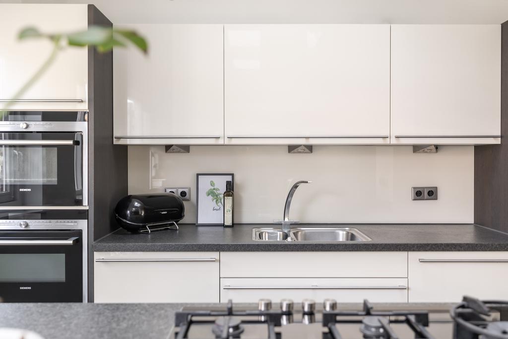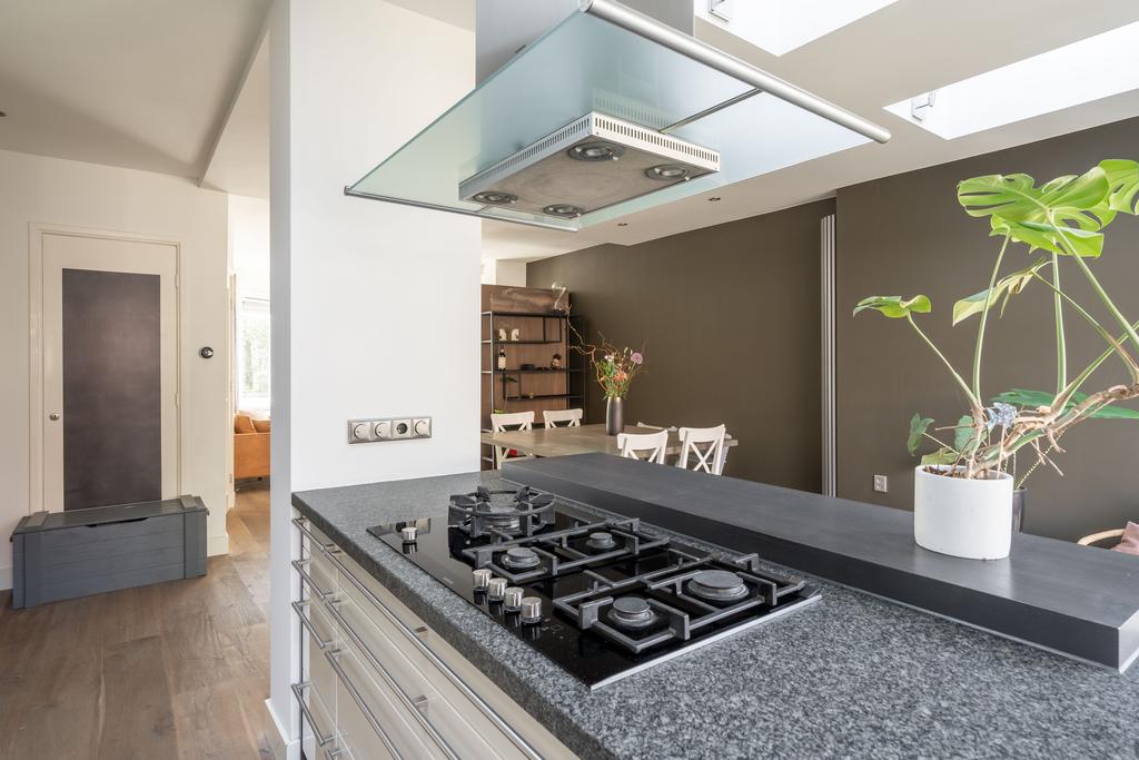De hoogwaardig afgewerkte keuken is voorzien van granieten werkblad, 5-pits gas-op-glas kookplaat met grote wokbrander en diverse inbouw apparatuur waaronder een koffiezetapparaat, koel/vriescombinatie, combimagnetron en combi-stoomoven (alles van Siemens)