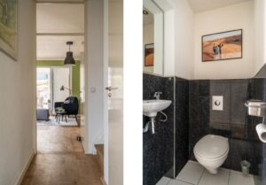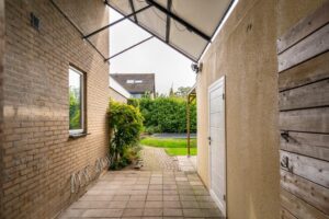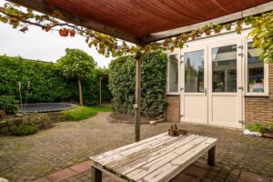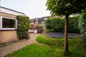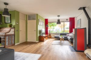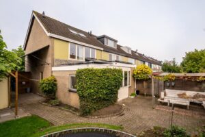 De woning ligt op een hoek aan een hofje. Door de aankoop van een extra perceel aan de zijkant is een ruime tuin ontstaan waar de huidige eigenaar een grote vrijstaande en volledige geisoleerde garage heeft gebouwd. De hoge bomen in de voortuin geven de woning een heerlijk gevoel van privacy. Bij binnenkomst vind je in de hal een toilet en een trap naar de eerste etage. Loop je door dan kom je in de ruime woonkamer.