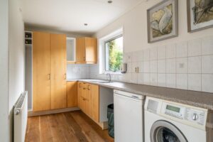 Bij het binnengaan van de woonkamer valt gelijk de pelletkachel op. Op koude dagen kun je de woonkamer verwarmen met deze gezellige haard. De woonkamer is ruim en hier zijn verschillende gezellige zitjes te creëren. Aan de woonkamer is een uitbouw geplaatst waar een mooie woonkeuken is gemaakt. Opvallend in de woonkeuken is het licht dat door de grote dakramen valt. De keuken is ruim en biedt plek voor een grote eettafel. Naast de woonkeuken bevindt zich de handige bijkeuken met wasmachine/droger opstelling. Hier is genoeg bergruimte te vinden.
