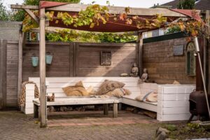 De tuin rondom de woning is ruim met verschillende zitjes. De achtertuin is gericht op het oosten en heeft voldoende zonligging door de grootte.