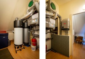Daarnaast is een technische ruimte gecreëerd op zolder. Hier vind je de warmtepomp- en boiler, de CV-installatie, de omvormers van de zonnepanelen en de mechanische ventilatie.