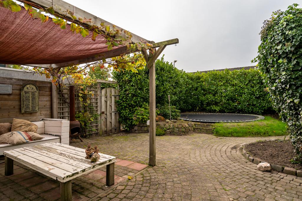 De tuin rondom de woning is ruim met verschillende zitjes. De achtertuin is gericht op het oosten en heeft voldoende zonligging door de grootte.