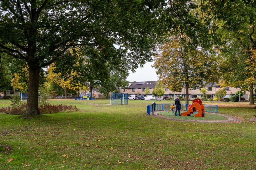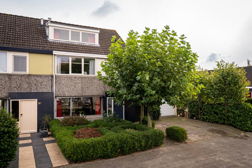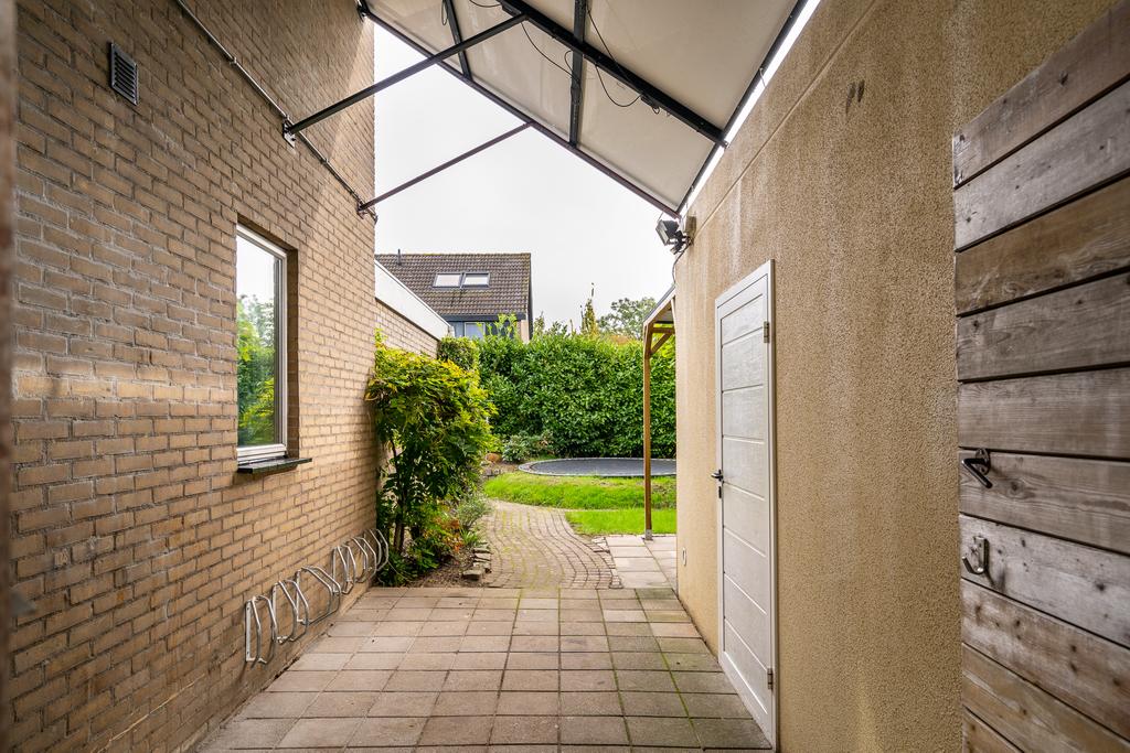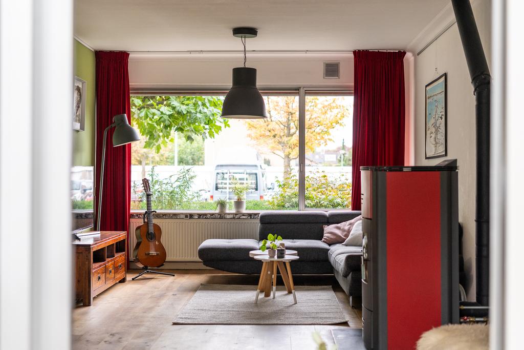De woning ligt op een hoek aan een hofje. Door de aankoop van een extra perceel aan de zijkant is een ruime tuin ontstaan waar de huidige eigenaar een grote vrijstaande en volledige geisoleerde garage heeft gebouwd. De hoge bomen in de voortuin geven de woning een heerlijk gevoel van privacy. Bij binnenkomst vind je in de hal een toilet en een trap naar de eerste etage. Loop je door dan kom je in de ruime woonkamer.