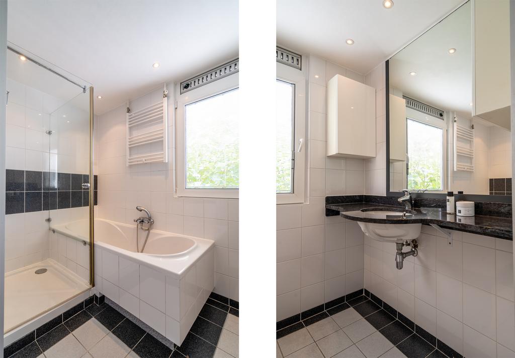Op de eerste etage bevinden zich 3 slaapkamers, 2 aan de achterzijde van 9m2 en 12 m2 en een slaapkamer aan de voorzijde van 12m2. Aan de voorzijde is ook de badkamer geplaatst met apart douche en bad. Op de overloop vind je de toegang tot het separate 2e toilet. De kozijnen op de eerste etage zijn van kunststof en geheel voorzien van dubbel glas.