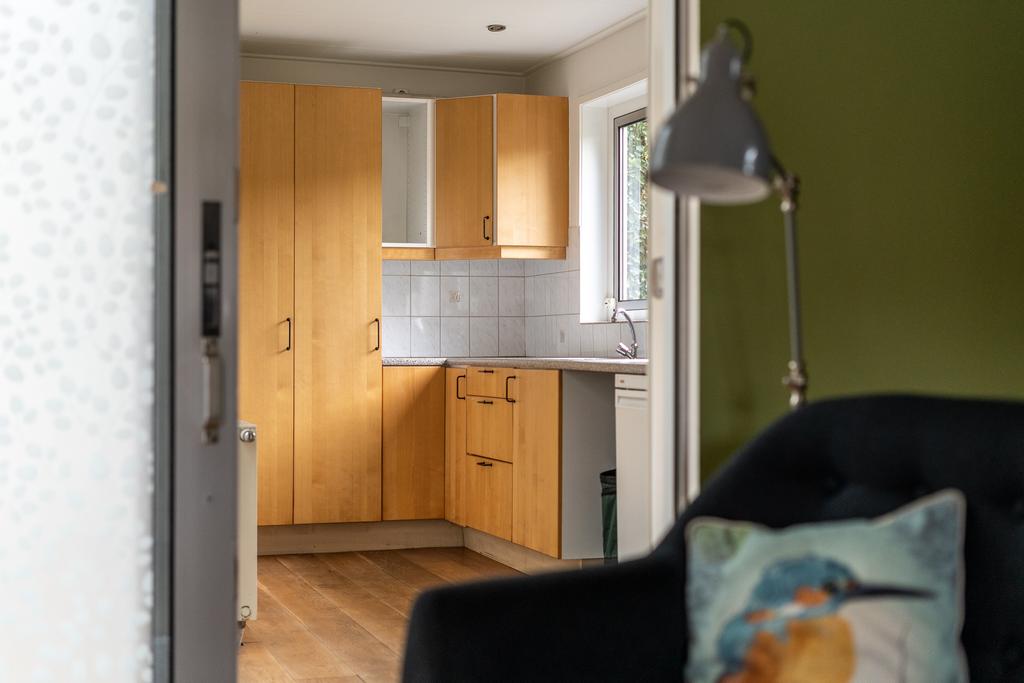 Bij het binnengaan van de woonkamer valt gelijk de pelletkachel op. Op koude dagen kun je de woonkamer verwarmen met deze gezellige haard. De woonkamer is ruim en hier zijn verschillende gezellige zitjes te creëren. Aan de woonkamer is een uitbouw geplaatst waar een mooie woonkeuken is gemaakt. Opvallend in de woonkeuken is het licht dat door de grote dakramen valt. De keuken is ruim en biedt plek voor een grote eettafel. Naast de woonkeuken bevindt zich de handige bijkeuken met wasmachine/droger opstelling. Hier is genoeg bergruimte te vinden.