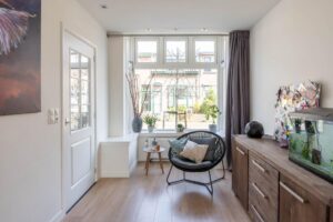 Wat meteen opvalt in dit huis zijn de fijne hoge plafonds en grote ramen. Dit geeft veel licht en een ruimtelijk gevoel. Aan de voorzijde schijnt in de charmante erker het licht fijn naar binnen en geniet je van het ochtendzonnetje. Een gezellige leesstoel zou hier niet misstaan. De huidige bewoners hebben in het middenstuk van de kamer een gezellige zithoek gecreëerd, een knusse hoek om lekker een film te kijken met het hele gezin.