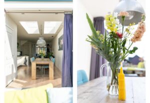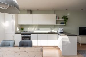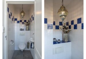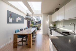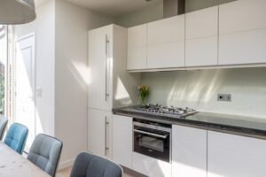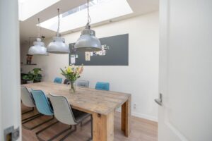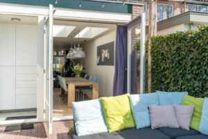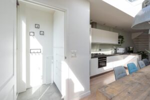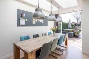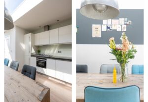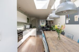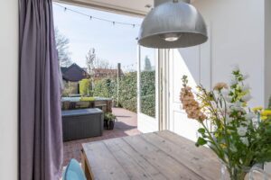 De woonkamer gaat over in een fraaie strak uitgevoerde woonkeuken. Er is ruimte voor een lange grote eettafel en de twee grote lichtkoepels erboven geven zeeën van licht. Dit maakt het een hele fijne plek om te vertoeven met vrienden en familie. De keuken is voorzien van diverse Siemens inbouwapparatuur zoals 5-pits gaskookplaat, koel- vries combinatie, vaatwasser, combi-oven en een quooker (Franke). De keuken is fraai afgewerkt met een betonnen werkblad en mat-witte greeploze fronten. De openslaande deuren in de achtergevel mogen natuurlijk niet ontbreken. Deze leiden naar de grote en diepe achtertuin. Daarnaast vind je achter nog een praktisch ‘klompenhok’ met op maat gemaakte kasten. De ideale plek voor sporttassen, schoenen en jassen.