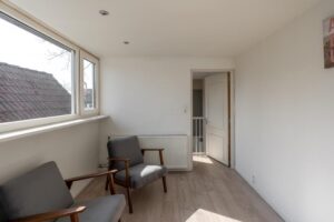 Een vaste trap brengt je naar de tweede verdieping. Ook op deze verdieping vind je door de twee grote dakkapellen aan weerszijden weer twee volwaardige kamers. Op dit moment zijn de kamers met elkaar verbonden maar door het plaatsen van een (schuif)deur zijn deze goed te scheiden en creëer je twee aparte kamers.