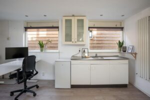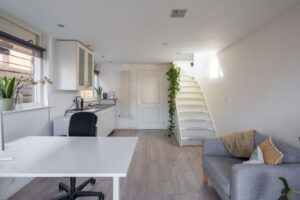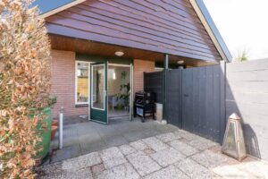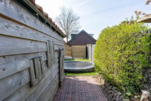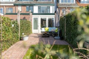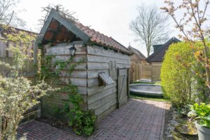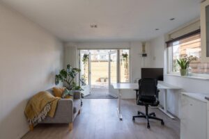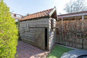 Achter op het perceel staat een groot en volwaardig bijgebouw met eigen opgang en terras. Het is geïsoleerd, beschikt over een kleine keuken, badkamer met douche en toilet, eigen cv-installatie, werkkamer beneden en boven nog een ruime overloop en slaapkamer. Dit bijgebouw kun je inzetten als een kantoor/werkruimte aan huis, studio of atelier. Wellicht ook geschikt voor een thuiswonend kind dat studeert en geen studentenkamer kan vinden door de kamernood!