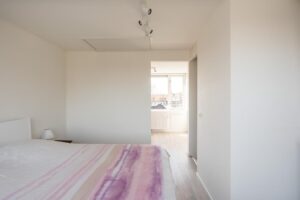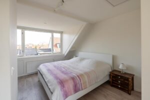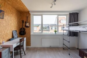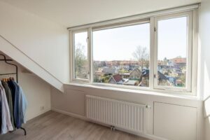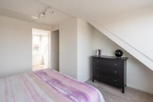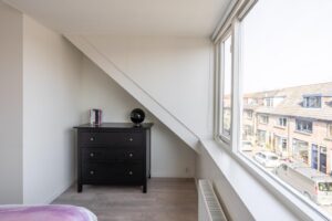 De kamer aan de voorzijde geeft weer zicht op de OLV toren. Naast bergruimte achter de knieschotten is er ook nog een kleine vliering om spullen op te bergen.