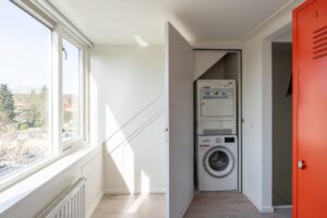 De kamer aan de achterzijde is momenteel in gebruik als was- en kleedruimte. De wasmachine en drogeropstelling zijn keurig weggewerkt in een op maat gemaakte kastenwand. Op de kamer aan de achterzijde geeft het grote raam van de dakkapel wederom een fantastisch uitzicht over de wijk, het bos Klein Zwitserland en de kerktoren.