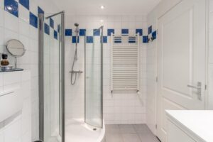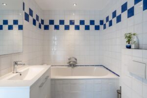 De trap in de woonkamer brengt je naar de eerste verdieping. De overloop geeft toegang tot twee slaapkamers en de badkamer. Ook deze verdieping is voorzien van keurige strakke wandafwerking en een fraaie laminaatvloer. De nette badkamer is van ruim formaat, in blauw-witte kleurstelling en voorzien van zowel ligbad, douche, toilet als wastafel. Er is slim gebruik gemaakt van de ruimte waardoor je twee plezierige slaapkamers hebt. Beide hebben een grote raampartij wat zorgt voor veel licht. De slaapkamer aan de voorzijde kijkt uit op de oude geveltjes in de straat en op de Onze Lieve Vrouwetoren. De slaapkamer aan de achterzijde kijkt plezierig weg over de diepe tuinen in de wijk.