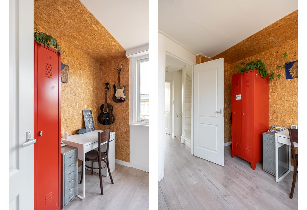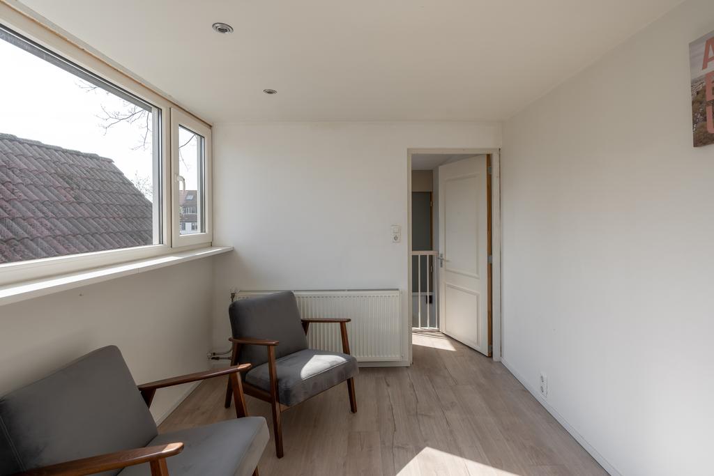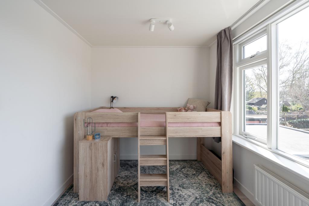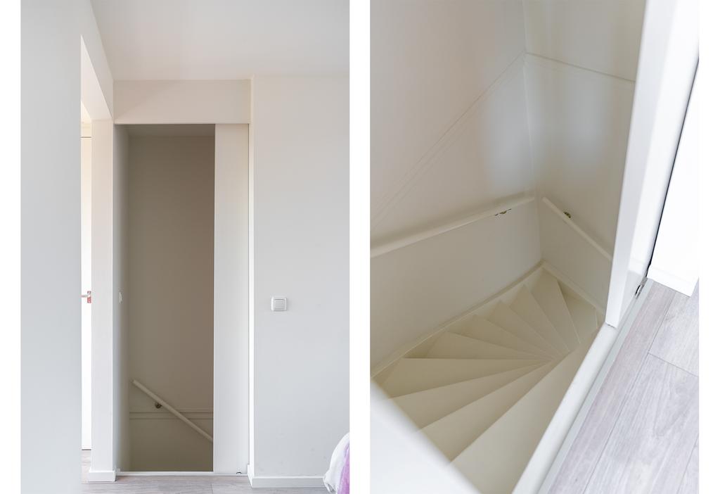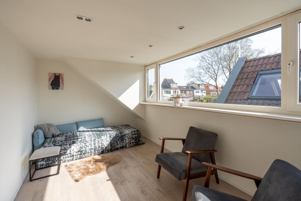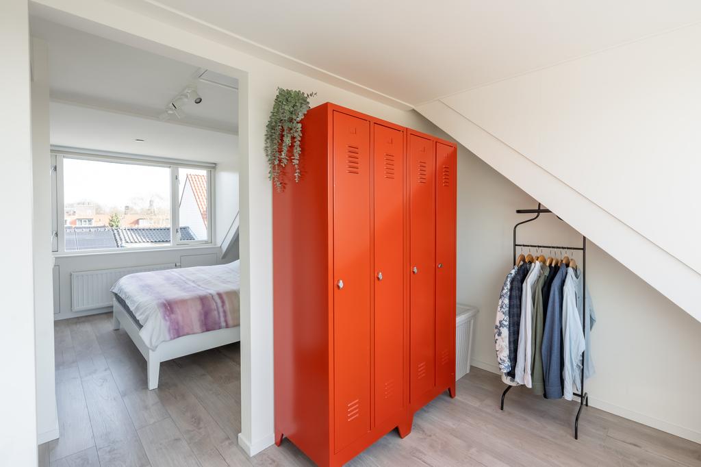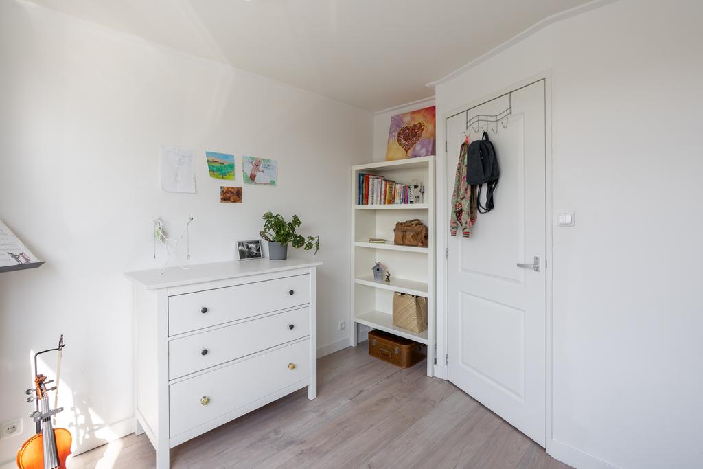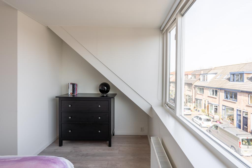 De kamer aan de achterzijde is momenteel in gebruik als was- en kleedruimte. De wasmachine en drogeropstelling zijn keurig weggewerkt in een op maat gemaakte kastenwand. Op de kamer aan de achterzijde geeft het grote raam van de dakkapel wederom een fantastisch uitzicht over de wijk, het bos Klein Zwitserland en de kerktoren.