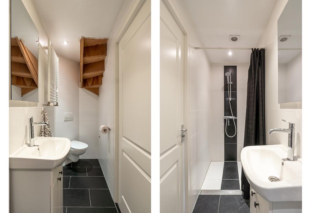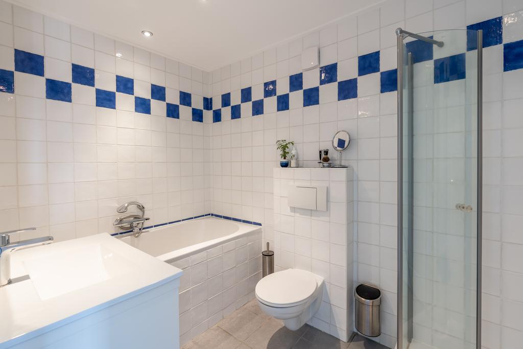 De trap in de woonkamer brengt je naar de eerste verdieping. De overloop geeft toegang tot twee slaapkamers en de badkamer. Ook deze verdieping is voorzien van keurige strakke wandafwerking en een fraaie laminaatvloer. De nette badkamer is van ruim formaat, in blauw-witte kleurstelling en voorzien van zowel ligbad, douche, toilet als wastafel. Er is slim gebruik gemaakt van de ruimte waardoor je twee plezierige slaapkamers hebt. Beide hebben een grote raampartij wat zorgt voor veel licht. De slaapkamer aan de voorzijde kijkt uit op de oude geveltjes in de straat en op de Onze Lieve Vrouwetoren. De slaapkamer aan de achterzijde kijkt plezierig weg over de diepe tuinen in de wijk.