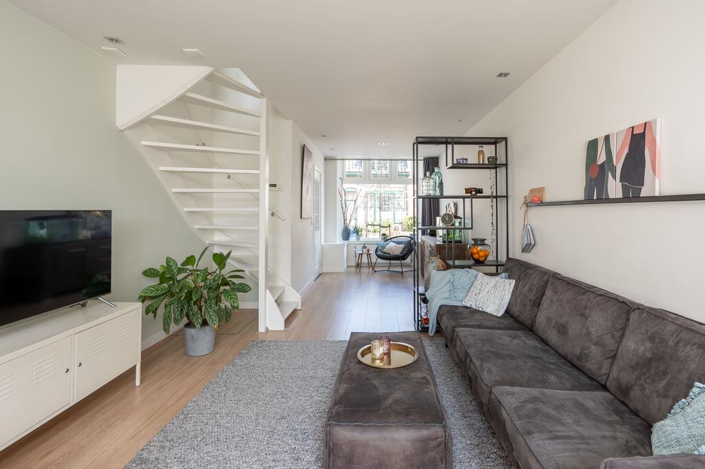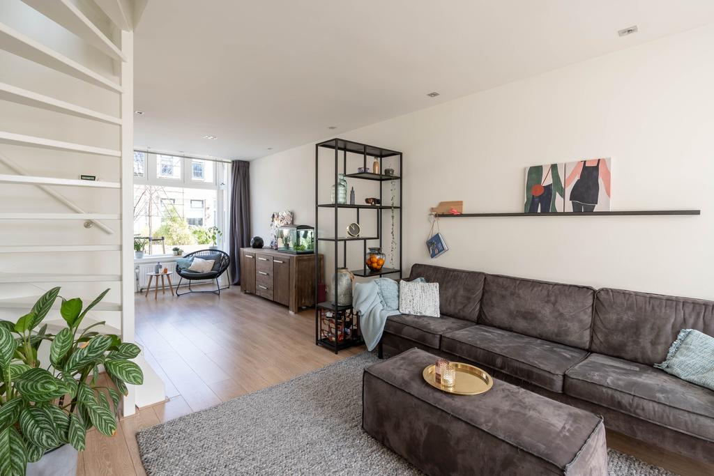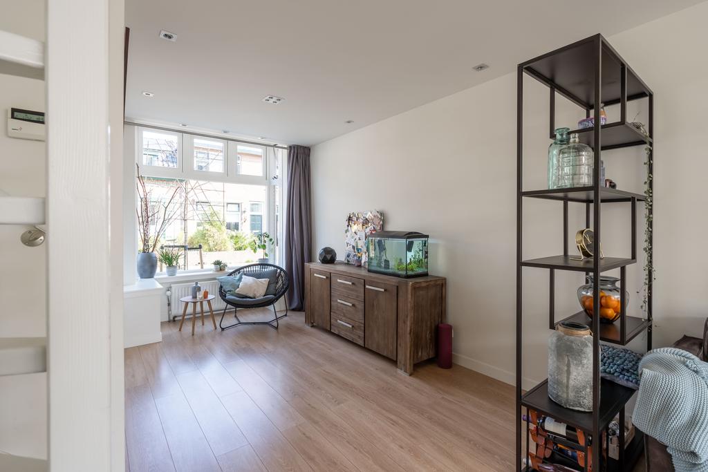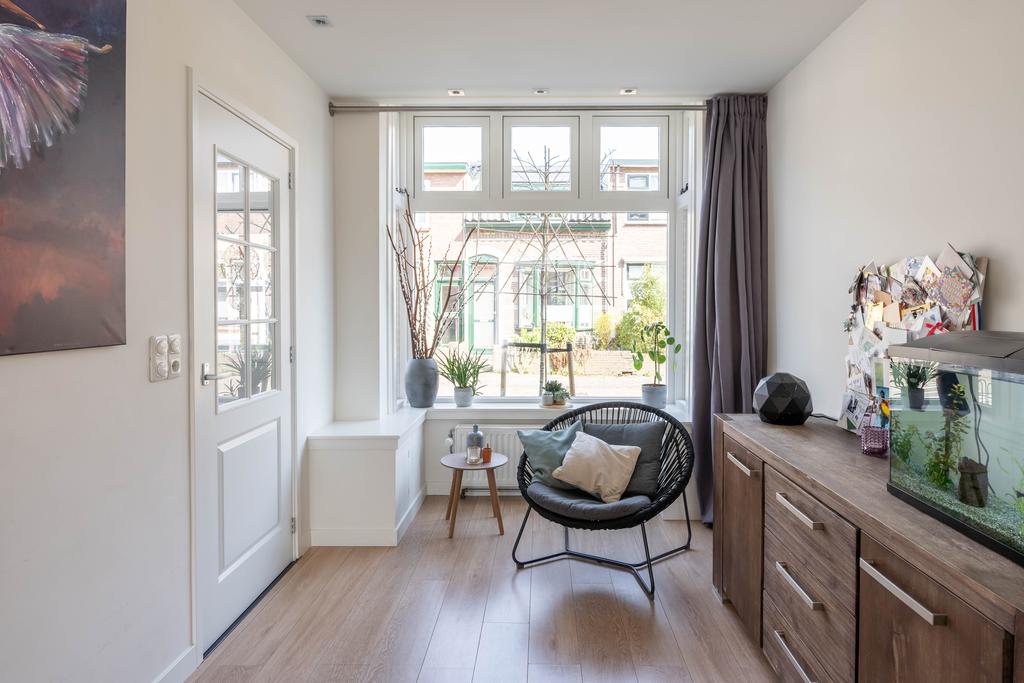 Wat meteen opvalt in dit huis zijn de fijne hoge plafonds en grote ramen. Dit geeft veel licht en een ruimtelijk gevoel. Aan de voorzijde schijnt in de charmante erker het licht fijn naar binnen en geniet je van het ochtendzonnetje. Een gezellige leesstoel zou hier niet misstaan. De huidige bewoners hebben in het middenstuk van de kamer een gezellige zithoek gecreëerd, een knusse hoek om lekker een film te kijken met het hele gezin.