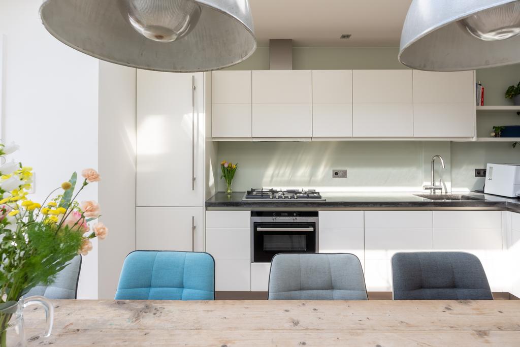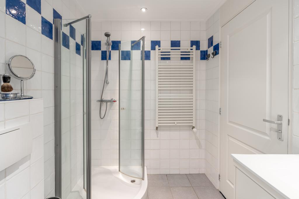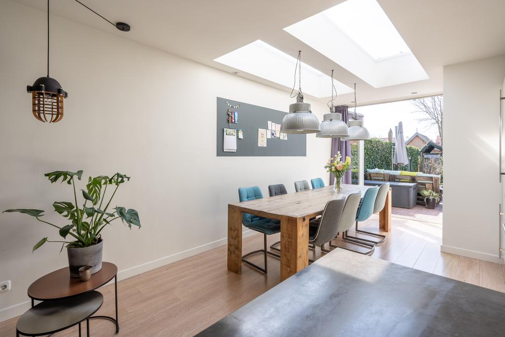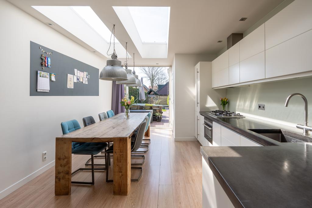 De woonkamer gaat over in een fraaie strak uitgevoerde woonkeuken. Er is ruimte voor een lange grote eettafel en de twee grote lichtkoepels erboven geven zeeën van licht. Dit maakt het een hele fijne plek om te vertoeven met vrienden en familie. De keuken is voorzien van diverse Siemens inbouwapparatuur zoals 5-pits gaskookplaat, koel- vries combinatie, vaatwasser, combi-oven en een quooker (Franke). De keuken is fraai afgewerkt met een betonnen werkblad en mat-witte greeploze fronten. De openslaande deuren in de achtergevel mogen natuurlijk niet ontbreken. Deze leiden naar de grote en diepe achtertuin. Daarnaast vind je achter nog een praktisch ‘klompenhok’ met op maat gemaakte kasten. De ideale plek voor sporttassen, schoenen en jassen.