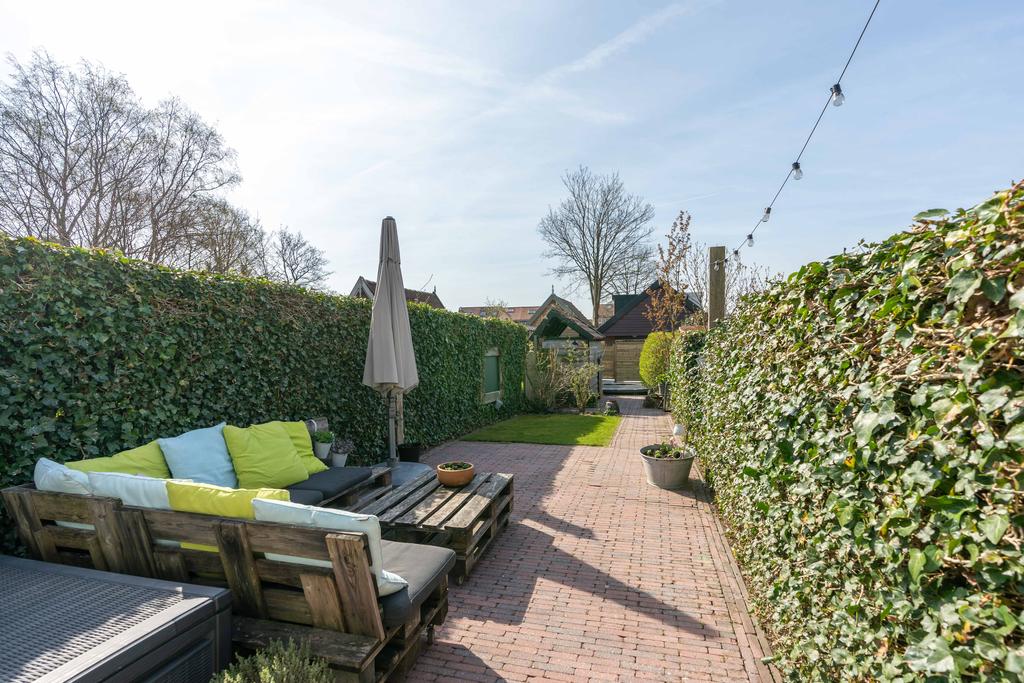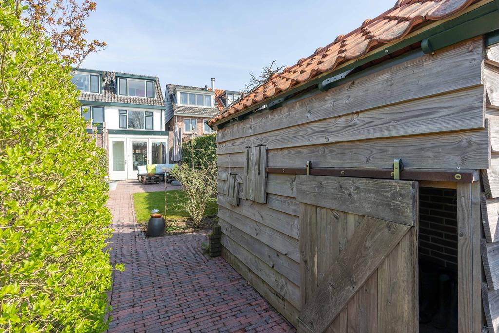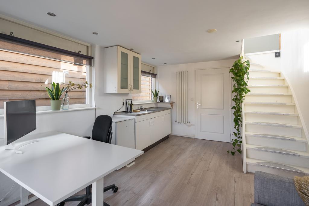 Achter op het perceel staat een groot en volwaardig bijgebouw met eigen opgang en terras. Het is geïsoleerd, beschikt over een kleine keuken, badkamer met douche en toilet, eigen cv-installatie, werkkamer beneden en boven nog een ruime overloop en slaapkamer. Dit bijgebouw kun je inzetten als een kantoor/werkruimte aan huis, studio of atelier. Wellicht ook geschikt voor een thuiswonend kind dat studeert en geen studentenkamer kan vinden door de kamernood!