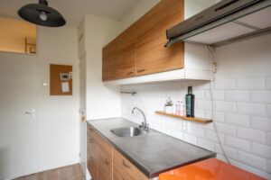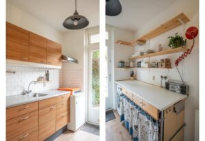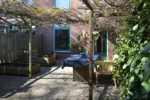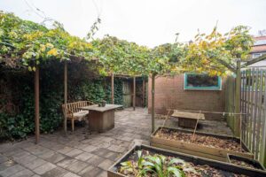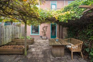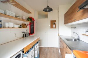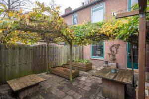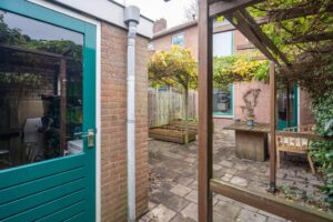 De keuken is van goed formaat en biedt voldoende ruimte om lekker te koken. Via de achterdeur in de keuken kom je in de tuin, die op het oosten is gelegen. Hier kun je heerlijk genieten op je eigen terras. Achterin de tuin vind je een ruime vrijstaande berging. De tuin is ook via een achterom te bereiken.