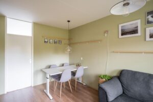 De woonkamer ligt aan de voorzijde, is ruim en fijn licht door de grote raampartij. In 2016 zijn HR++ ramen geplaatst wat heerlijk comfortabel wonen is. Je kijkt uit op een parkachtige omgeving. Aan de achterzijde van het appartement ligt de keuken en de slaapkamer. De slaapkamer is ruim (10m2) en heeft voldoende plaats voor een goede kast. De grote raam geef veel licht en een plezierig uitzicht over uitzicht over de tuin.