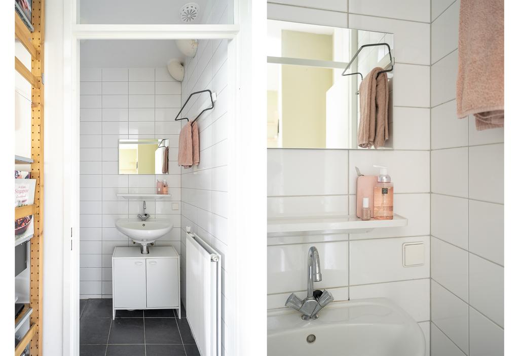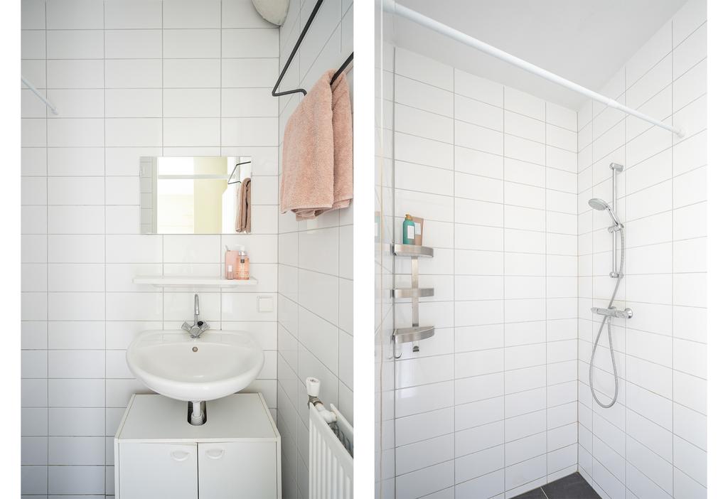 De badkamer is netjes afgewerkt in zwart-wit kleurstelling. De badkamer beschikt over een wastafel en een ruime inloopdouche.