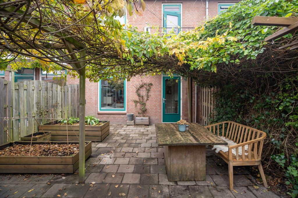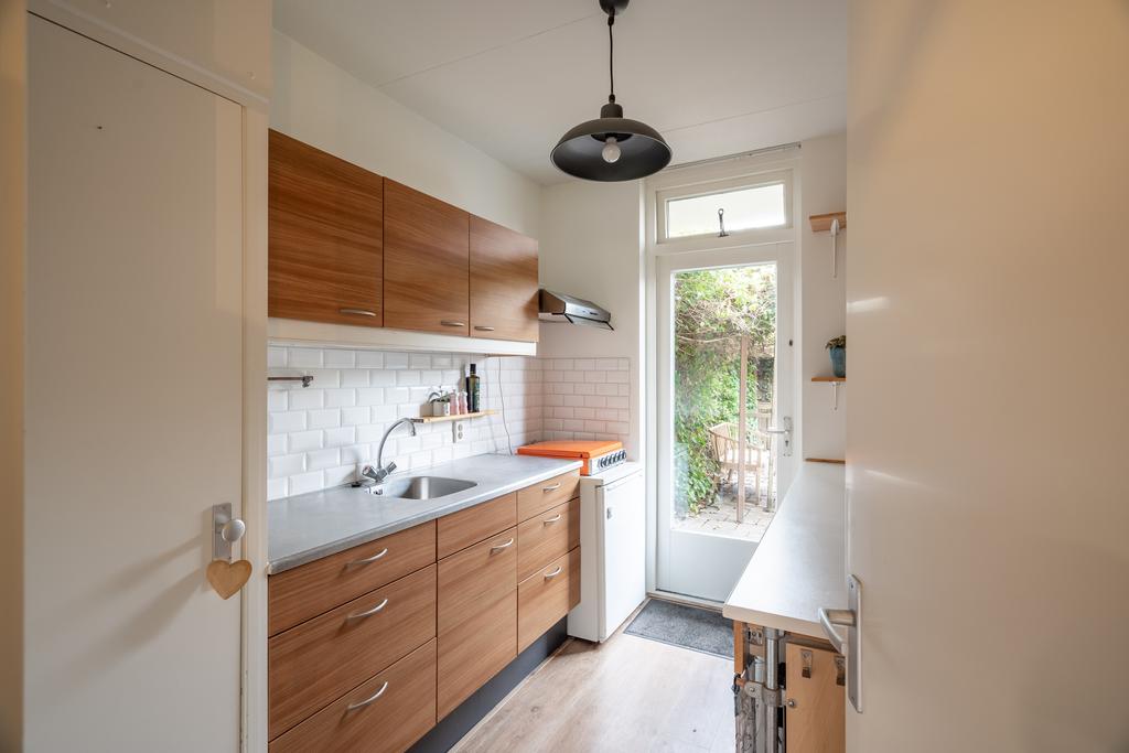 De keuken is van goed formaat en biedt voldoende ruimte om lekker te koken. Via de achterdeur in de keuken kom je in de tuin, die op het oosten is gelegen. Hier kun je heerlijk genieten op je eigen terras. Achterin de tuin vind je een ruime vrijstaande berging. De tuin is ook via een achterom te bereiken.