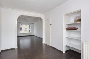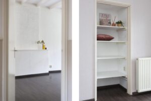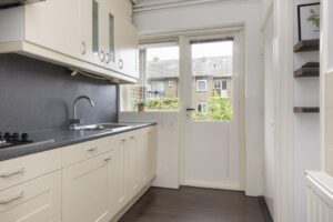 De keuken is in lichte kleurstelling en is netjes onderhouden en voorzien van een 4-pits gaskookplaat, afzuigkap en vaatwasser. Een nis in de keuken geeft ruimte voor een koelkast en/of wasmachine. Verder vind je hier de deur naar het eerste kleine balkon, een fijne plek om je eerste kop koffie van de dag of ontbijtje te nuttigen.