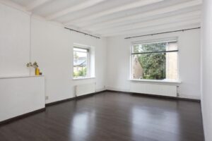 De woonkamer ligt aan de voorzijde. Door de hoekligging heeft deze kamer een extra raam aan de zijgevel wat het tot een zeer prettige en lichte ruimte maakt. De zon draait er heerlijk om heen. De oude schouw, sierbalken plafond en vaste kast geven veel sfeer aan de ruimte.