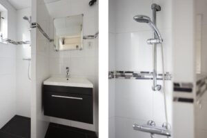 Vanuit de keuken bereik je badkamer (2010). Deze is voorzien van wastafel en inloopdouche en kent een neutrale wit/grijs kleurstelling; een grote witte tegel en een strakke sierrand in mozaïek. Het appartement heeft een apart toilet dat toegankelijk is vanuit de centrale hal.