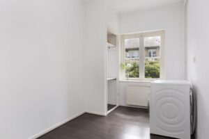 De tweede slaapkamer bevindt zich aan de achterzijde. Hier vind je ook een wasmachine aansluiting. Heb je de wasmachine liever in de keuken, dan kan dat want ook daar bevindt zich nog een aansluiting.