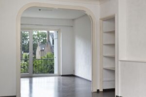 In het verlengde van de woonkamer bevindt zich aan de achterzijde van het appartement de eetkamer. Ook hier vind je weer een vaste kast. De eetkamer heeft een ruim balkon, wegkijkend over de groene wijk en fraaie tuinen. Mocht je een derde slaapkamer wensen, dan kan je deze eetkamer ook eenvoudig weer dichtmaken. De kamer heeft namelijk een eigen toegangsdeur vanaf de centrale hal.