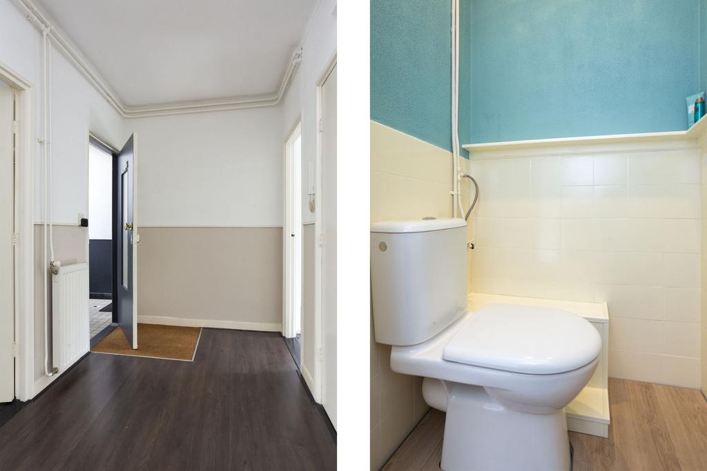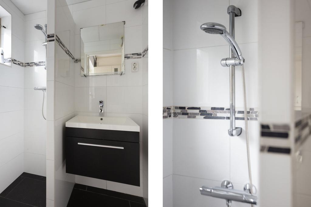Vanuit de keuken bereik je badkamer (2010). Deze is voorzien van wastafel en inloopdouche en kent een neutrale wit/grijs kleurstelling; een grote witte tegel en een strakke sierrand in mozaïek. Het appartement heeft een apart toilet dat toegankelijk is vanuit de centrale hal.