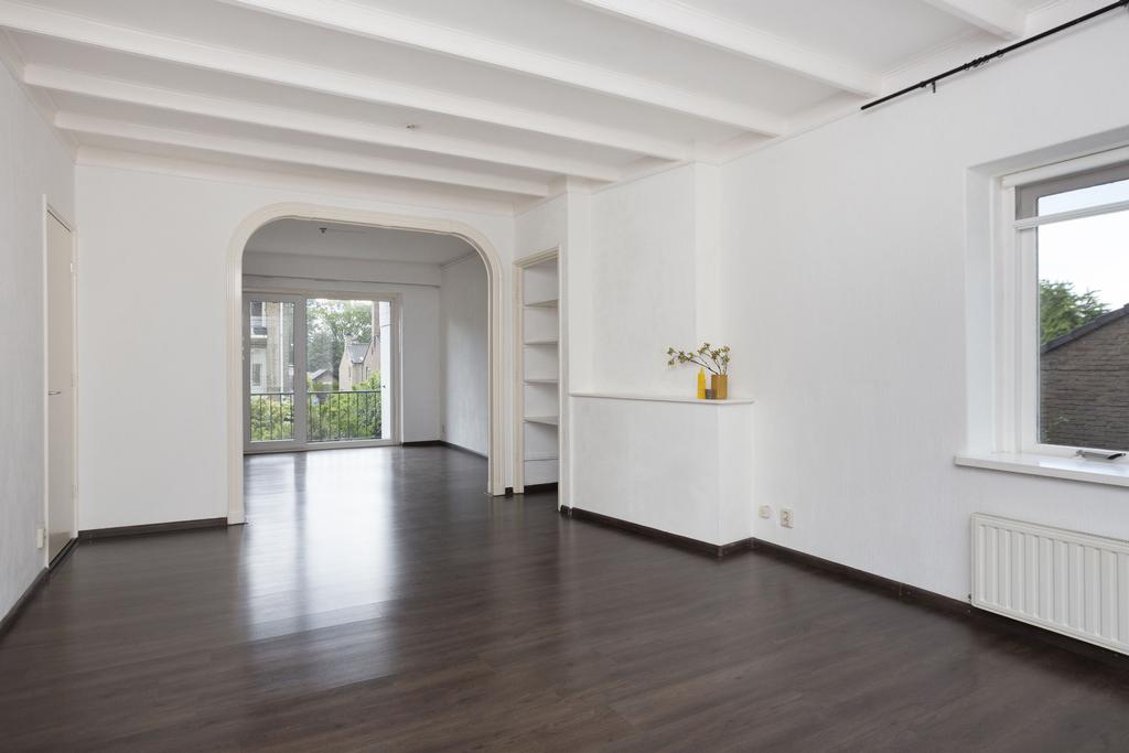 In het verlengde van de woonkamer bevindt zich aan de achterzijde van het appartement de eetkamer. Ook hier vind je weer een vaste kast. De eetkamer heeft een ruim balkon, wegkijkend over de groene wijk en fraaie tuinen. Mocht je een derde slaapkamer wensen, dan kan je deze eetkamer ook eenvoudig weer dichtmaken. De kamer heeft namelijk een eigen toegangsdeur vanaf de centrale hal.