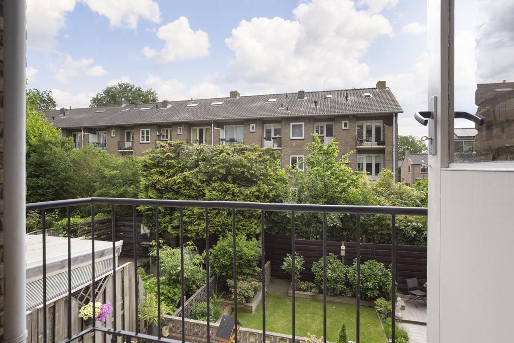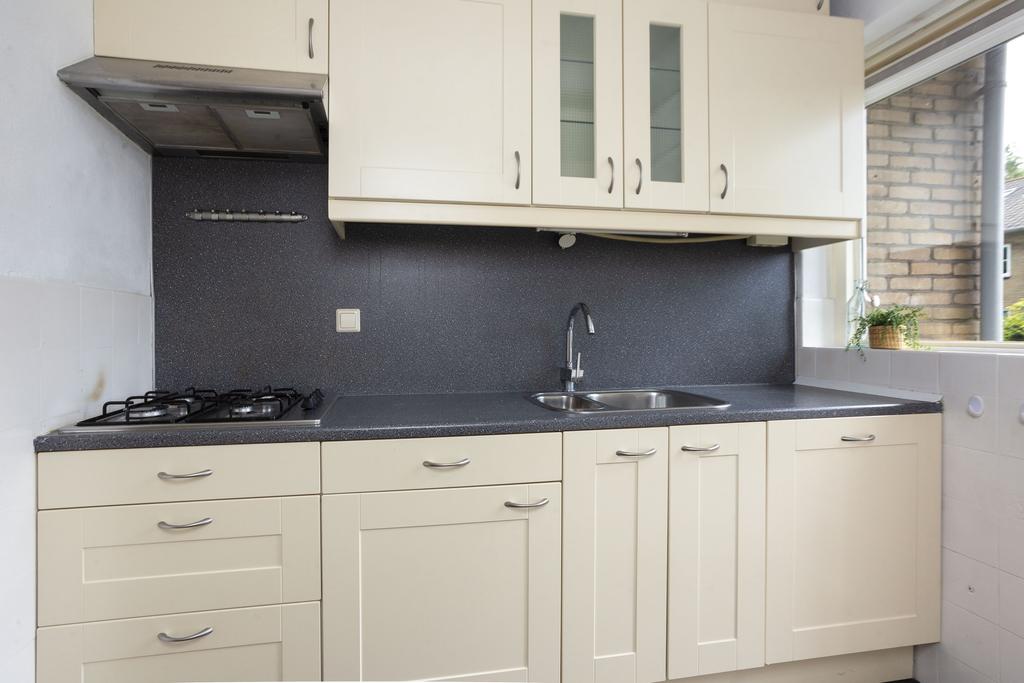 De keuken is in lichte kleurstelling en is netjes onderhouden en voorzien van een 4-pits gaskookplaat, afzuigkap en vaatwasser. Een nis in de keuken geeft ruimte voor een koelkast en/of wasmachine. Verder vind je hier de deur naar het eerste kleine balkon, een fijne plek om je eerste kop koffie van de dag of ontbijtje te nuttigen.