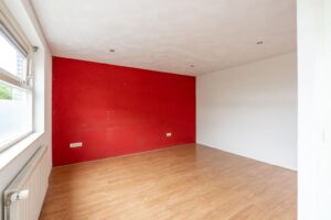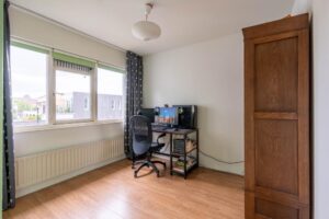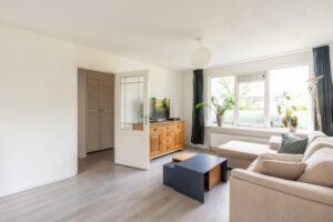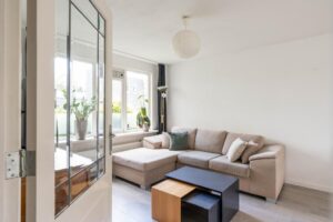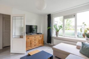 De woonkamer bevindt zich aan de voorzijde en is plezierig licht door de grote raampartij; een fijne plek om thuis te komen. Er is genoeg ruimte voor een grote zithoek en eettafel.