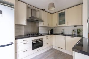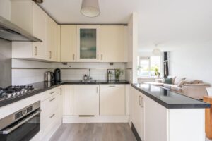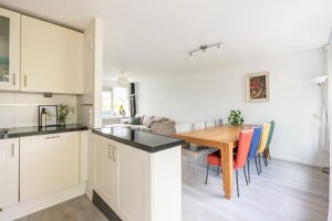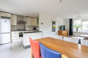 Aan de achterzijde bevindt zich de open keuken. Deze is afgewerkt met mat-witte frontjes en een donkergraniet aanrechtblad. De keuken is verder voorzien van diverse inbouwapparatuur, waaronder een 5-pits gasfornuis, vaatwasser en Bosch combi-oven. Door de hoekopstelling biedt de keuken veel bergruimte voor al je keukenspullen.