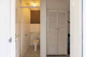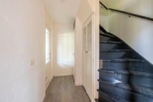 De hal is ruim en geeft toegang tot meterkast, trapkast, toilet en trap naar de eerste verdieping. Het toilet is in lichte kleurstelling en voorzien van fonteintje. Over de gehele benedenverdieping ligt een laminaatvloer.