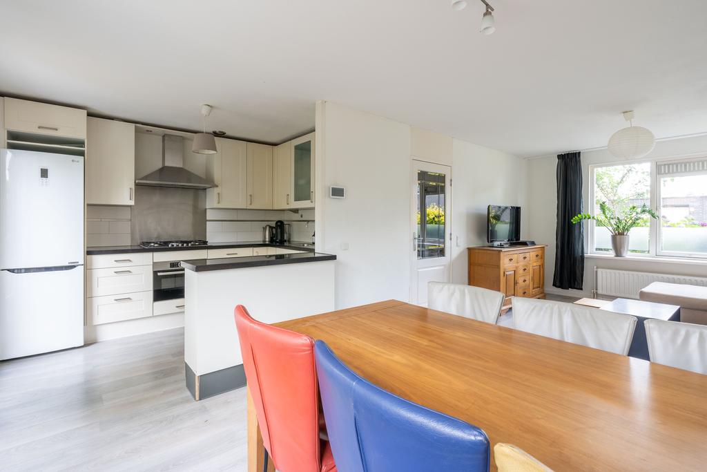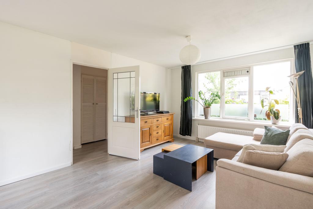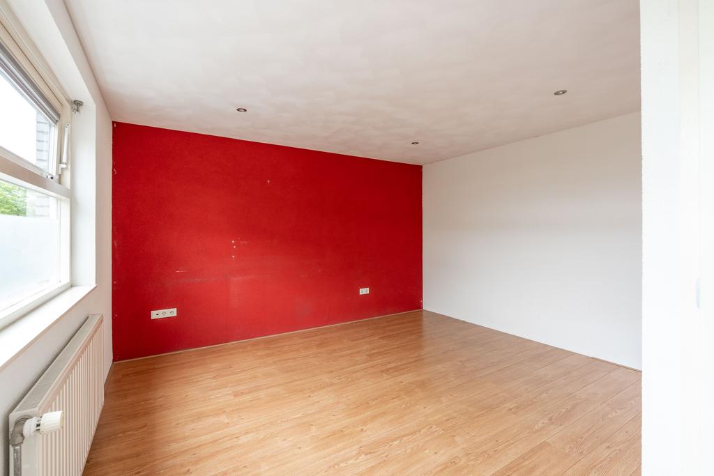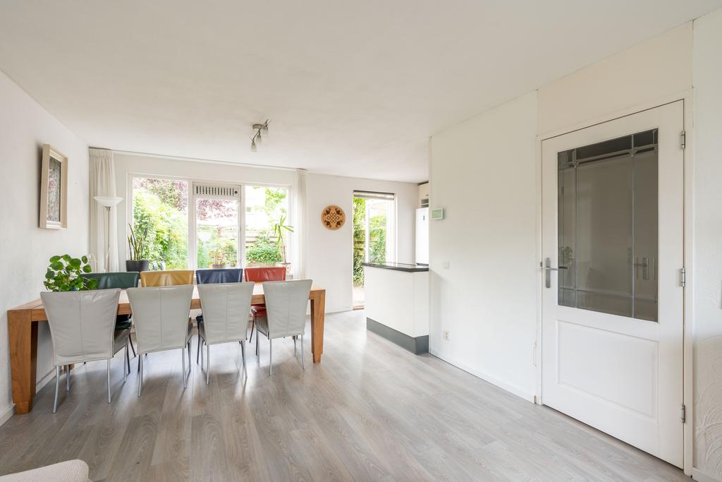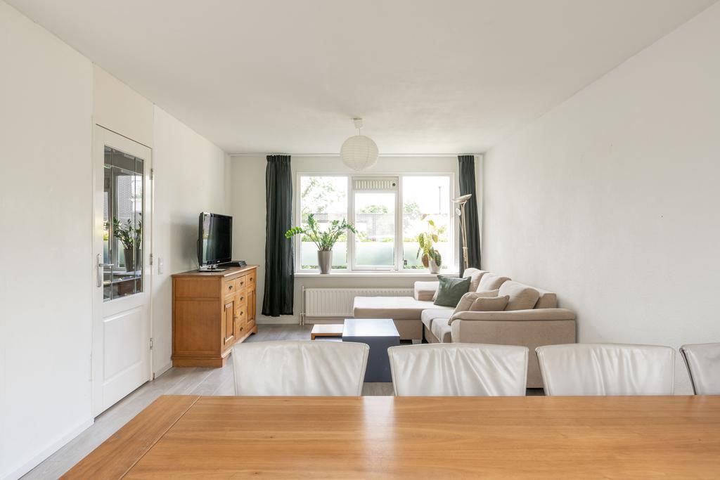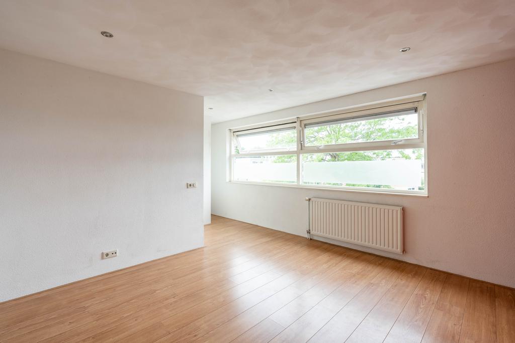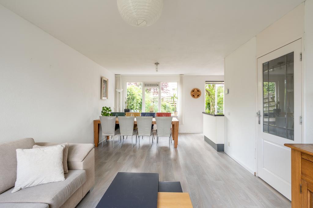 De woonkamer bevindt zich aan de voorzijde en is plezierig licht door de grote raampartij; een fijne plek om thuis te komen. Er is genoeg ruimte voor een grote zithoek en eettafel.