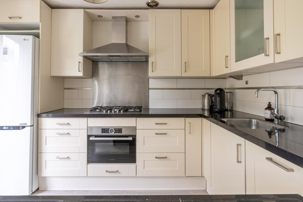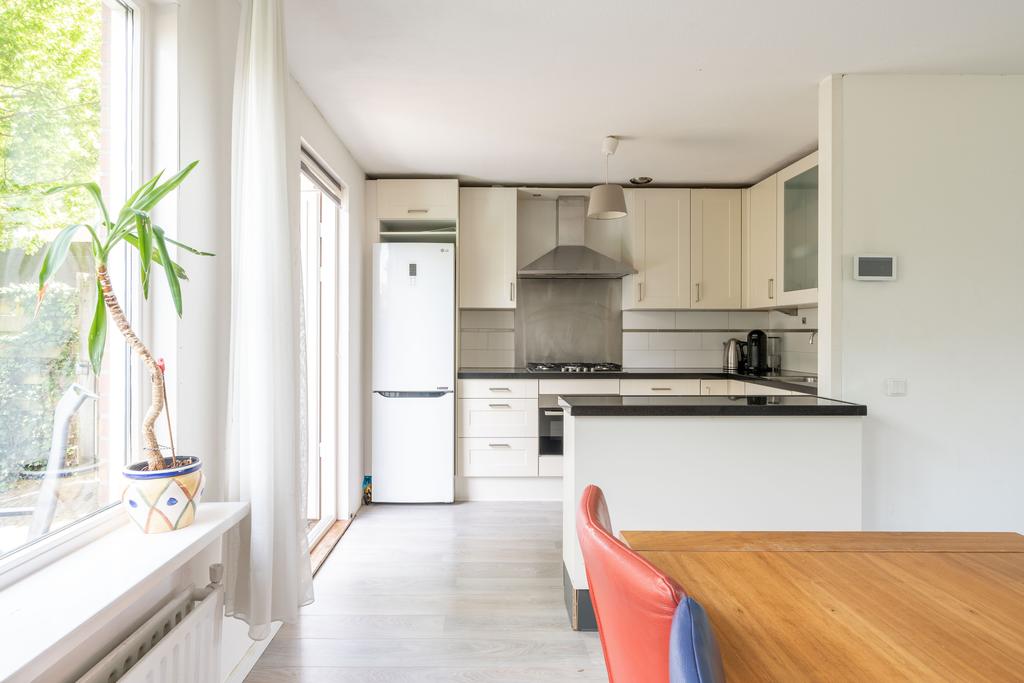 Aan de achterzijde bevindt zich de open keuken. Deze is afgewerkt met mat-witte frontjes en een donkergraniet aanrechtblad. De keuken is verder voorzien van diverse inbouwapparatuur, waaronder een 5-pits gasfornuis, vaatwasser en Bosch combi-oven. Door de hoekopstelling biedt de keuken veel bergruimte voor al je keukenspullen.